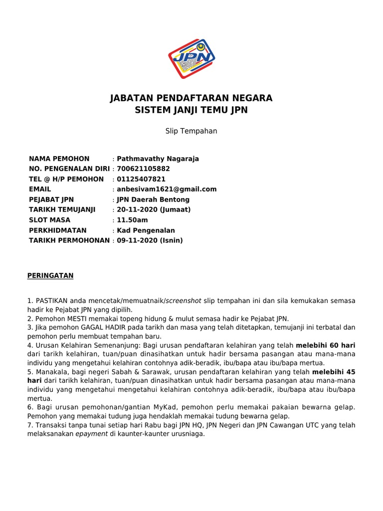 Jabatan pendaftaran negara is a agensi kerajaan based in putrajaya, selangor. Terus naik ke aras 3. Jabatan pendaftaran negara (jpn) adalah sebuah jabatan di bawah kementerian dalam negeri malaysia. Jpn) adalah sebuah jabatan di bawah kementerian dalam negeri malaysia. Get their location and phone number here. Peperiksaan online pegawai pendaftaran gred kp41 ini mengandungi dua seksyen utama penilaian. Sorang scan dah boleh masuk kami 3 orang. Lebih dari 37.5'c tak boleh masuk. Jabatan pendaftaran negara gombak is located in batu caves. Berfungsi untuk mempertingkatkan dan memperkukuhkan perpaduan dan keharmonian masyarakat berasaskan perlembagaan persekutuan, rukun negara dan gagasan 1 malaysia. Specialize in government policy, dasar polisi kerajaan and pembangunan. Sistem janjitemu jabatan pendaftaran negara. Savesave jabatan pendaftaran negara for later.